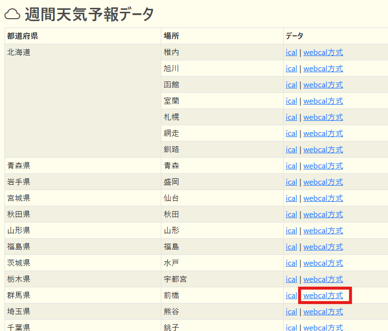 2.自分の地域の「webcal方式」を右クリックしてURLをコピーします。