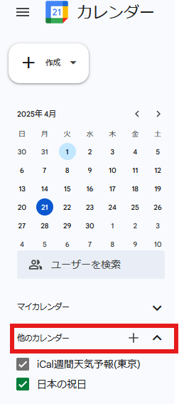 Googleカレンダーの左下にある「他のカレンダー」横の「+」をクリック