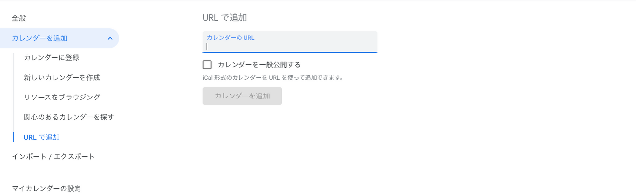 4.「URL で追加」に先ほどコピーしたiCalのURLをペーストして、「カレンダー追加」をクリックします。